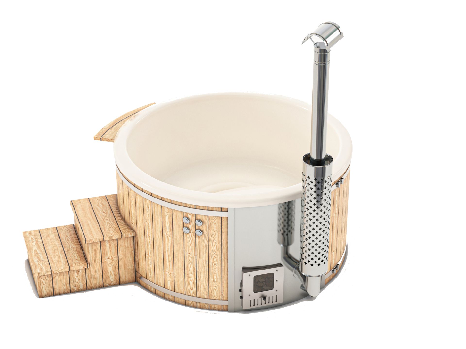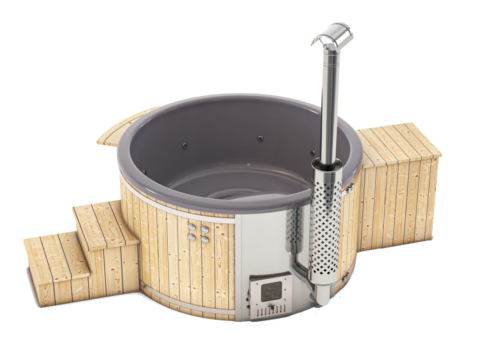 En rund badtunna i trä med svart lock, extern metallvärmare och en uppsättning böjda trappsteg i trä mot en vit bakgrund.